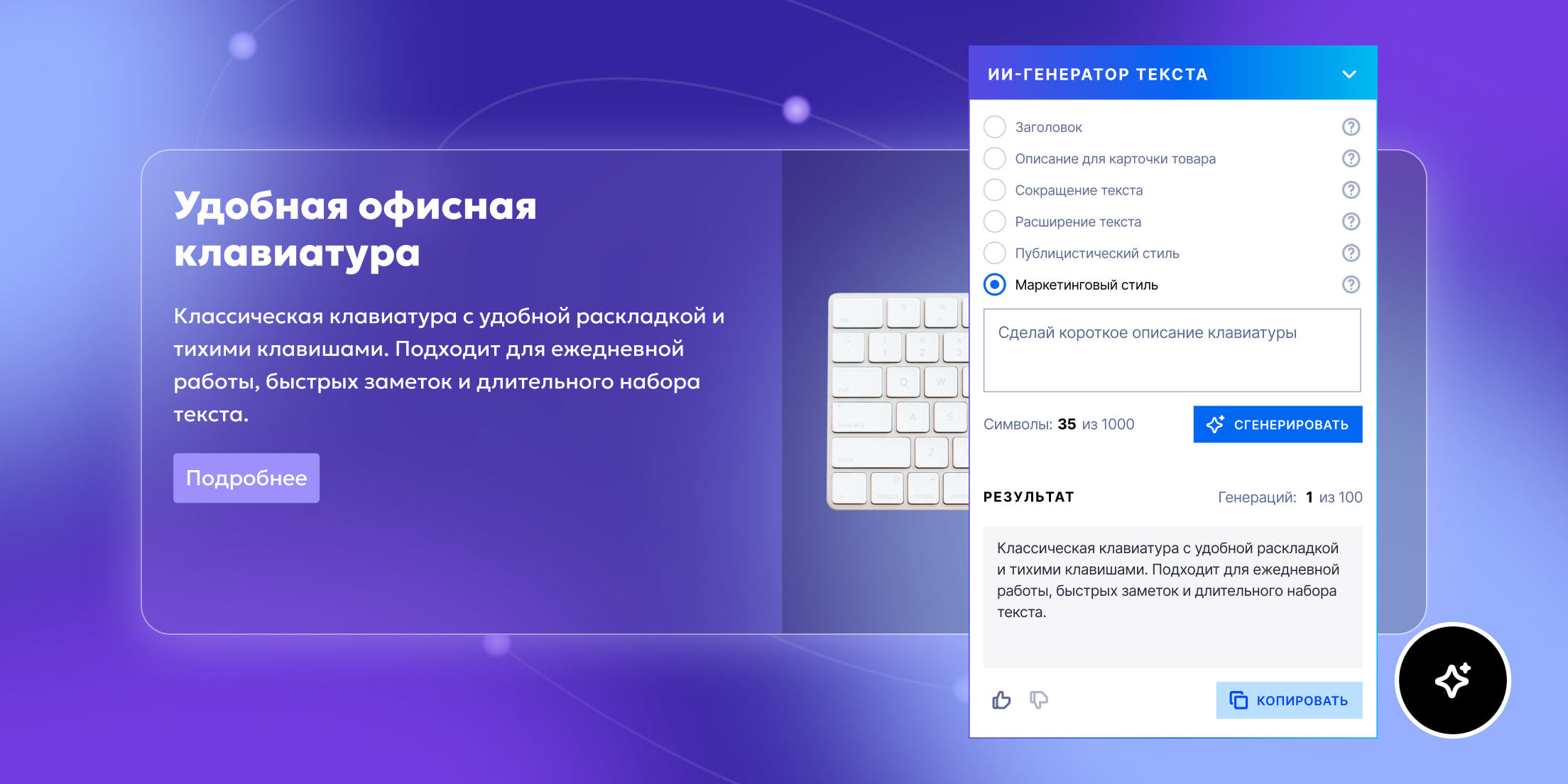 Писать тексты для сайта — задача, которая часто отнимает много времени и сил. Теперь с этим поможет искусственный интеллект. Для клиентов конструктора сайтов с платным тарифом теперь доступен ИИ-генератор текстов! Найти его можно во всех редакторах текстов в новых блоках.
